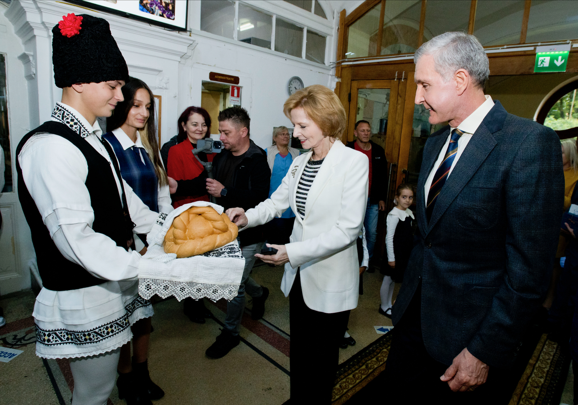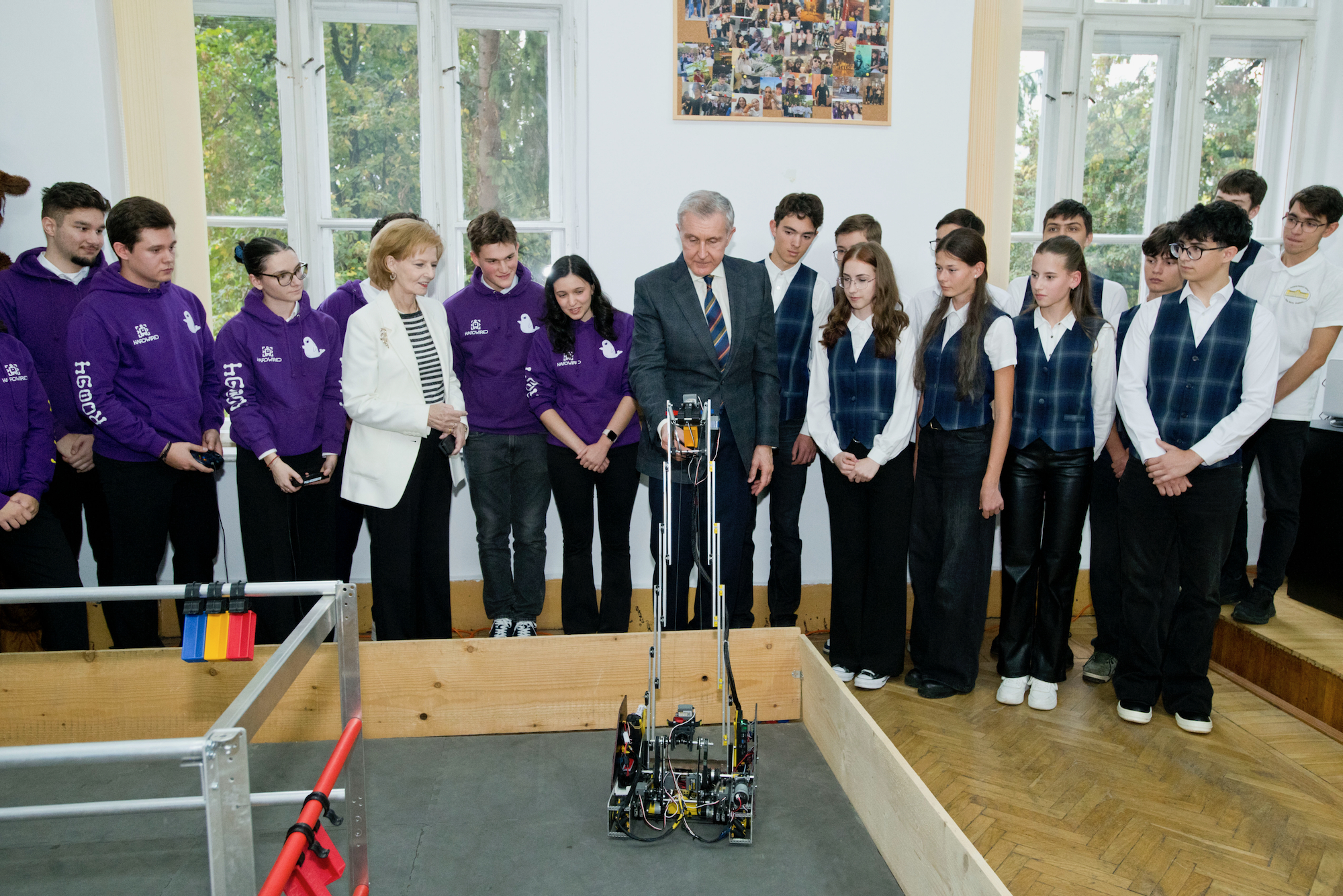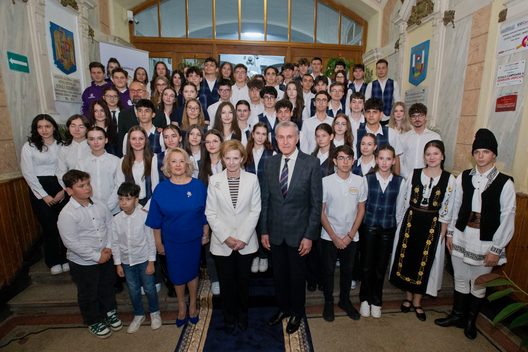 ![]() După-amiază, Custodele Coroanei și Principele Radu au vizitat Liceul Vocațional Reformat din Târgu Mureș, una dintre cele mai vechi instituții de învățământ din Transilvania, fondată în anul 1556. Oaspeții regali au fost întâmpinați de directorul Benedek Zsolt, care le-a prezentat istoria liceului și piatra de temelie expusă la etajul I al clădirii. În sala istorică de festivități, Majestatea Sa și Alteța Sa Regală s-au întâlnit cu elevii și profesorii liceului. Programul a cuprins un moment artistic susținut de ansamblul coral al școlii, precum și de elevi de la profilul teologic, care au cântat la fluier baroc, instrument tradițional reintrodus în repertoriul educațional. Familia Regală a adresat audienței un cuvânt de mulțumire și a adus felicitări profesorilor și elevilor, pentru felul exemplar în care duc mai departe credința, educația și o tradiție de cinci secole. Pe parcursul vizitei, Custodele Coroanei și Principele Radu au vizitat laboratoarele moderne ale școli și spațiile de învățământ în care actualmente sunt pregătiți peste 700 de elevi, de la vârsta preșcolară până la studiile post-liceale. AGERPRES În continuare, Custodele Coroanei și Principele Radu au vizitat Colegiul Național „Unirea” din Târgu Mureș, liceu de prestigiu înființat în secolul al XIX-lea, recunoscut pentru calitatea academică și pentru activitatea internațională a elevilor și profesorilor săi. Oaspeții au fost întâmpinați de directorul Aurora Manuela Stănescu. Majestatea Sa și Alteța Sa Regală au vizitat Cercul de Robotică „Hardwired: Tehnologia CN unește”, unde elevii au prezentat activitățile cercului și au realizat o demonstrație practică. În continuare, a urmat vizitarea Centrului de excelență în biologie, unde s-a desfășurat un scurt „maraton experimental”, și prezentarea proiectelor europene Erasmus+ și eTwinning, prin care elevii își dezvoltă competențele științifice și spiritul de colaborare internațională. De asemenea, Majestatea Sa și Alteța Sa Regală au asistat la o lecție de Debate, pe tema „Monarhia – instituție a trecutului sau model pentru viitor?” Pe parcursul vizitei, Familia Regală a dialogat cu profesorii, cu elevii din diferite clase liceale și au vizitat vastele spații de învățământ ale instituției. Pe holurile colegiului au fost amenajate standuri de carte și expoziții dedicate proiectelor educaționale europene în care instituția este implicată. Vizita s-a încheiat seara, cu o fotografie de grup, cuprinzând marea familie a elevilor de toate vârstele și a profesorilor. Liceul Vocațional Reformat ![]() ![]() ![]() ![]() ![]() ![]() ![]() ![]() ![]() Colegiul Național “Unirea” ![]() ![]() ![]() ![]() ![]() ![]() ![]() ![]() ![]() ![]() ©Daniel Angelescu, Casa Majestății Sale |