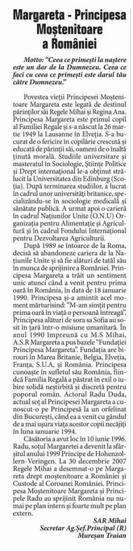 ©Adevărul Articol de Loreta Popa, Jurnalul național, 25 martie 2014 Întreaga experienţă a reîntoarcerii în ţara pe care o cunoştea doar din fotografii sau din poveştile de familie a reprezentat o schimbare incredibilă în viaţa Alteţei Sale Regale Principesa Margareta…