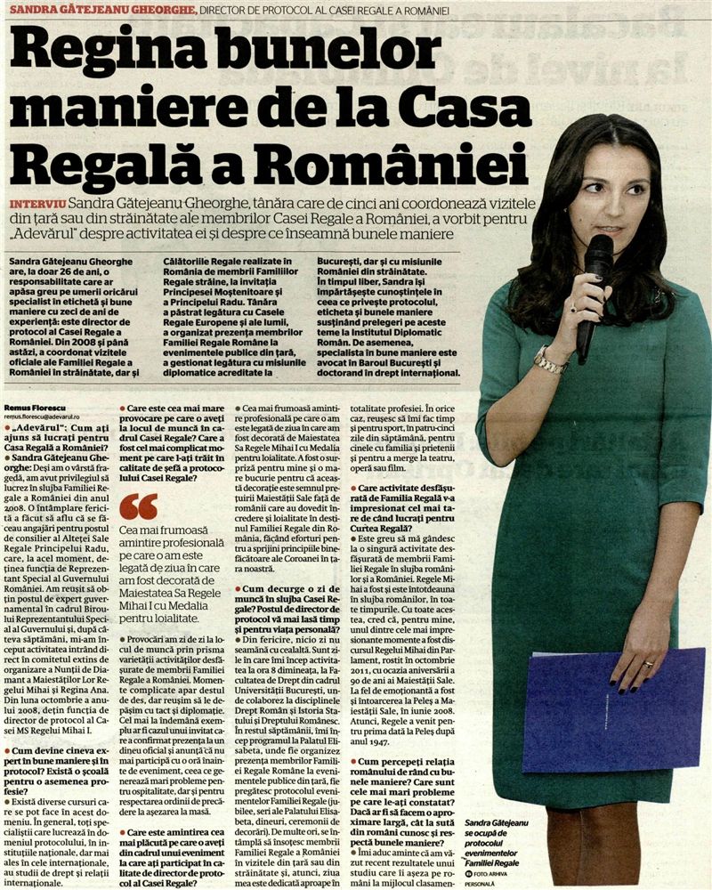 Doamna Sandra Gatejeanu Gheorghe este ea insasi o persoana de aleasa conduita, calma in toate circumstantele – si inspirand calm celor din jur – , indeplinindu-si indatoririle cu firescul, politetea si echilibrul ce sunt fundamentul desfasurarii cu succes al tuturor situatiile si ceremoniilor de la Curtea Regala. Ocuparea acestei inalte functii nu au facut-o deloc ‘teapana’ si aroganta asa cum poate s-ar gandi cei ce ei insisi sunt certati cu buna crestere. Asa cum se si cuvine unei persoane in care Majestatea sa si Altetele Lor au investit incredere, Doamna Sandra Gatejeanu este cea care da tonul in cazul unei ceremonii. Lipsa stridentelor este lectia de baza pe care membrii societatii romanesti ar trebui sa si-o insuseascca din copilarie, precum si respectul elementar pentru cei din jur, acestea fiind fondul pe care se altoiesc ulterior celelalte componente ale manierelor. Astfel, bunele maniere nu mai sunt percepute drept constrangeri sau incorsetari ci vor fi simtite drept elemente necesare in viata de zi cu zi. Doamna Gatejeanu tocmai acest lucru realizeaza sa comunice celor din jur, nu prin cuvinte ci prin exemplul personal. Cu siguranta ca si parintii sai au crescut-o in acest mod, netezindu-i calea spre ceea ce este astazi.