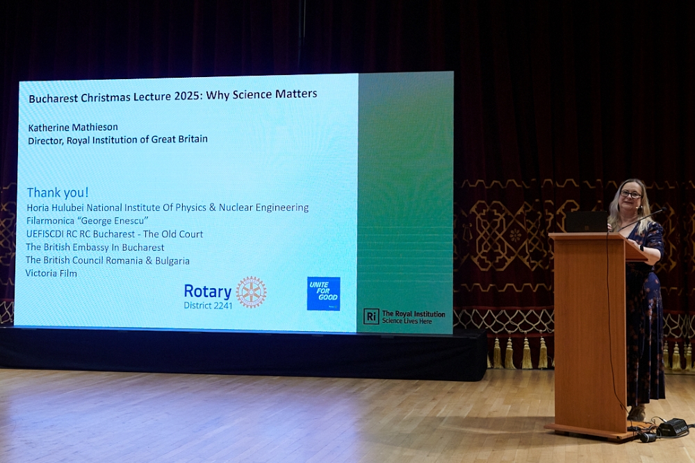 Doamna Katherine Mathieson a susținut conferința cu titlul “Why Science Matters”, o reflecție asupra importanței științei în viața de zi cu zi și asupra rolului pe care educația științifică îl joacă în formarea societăților modene.