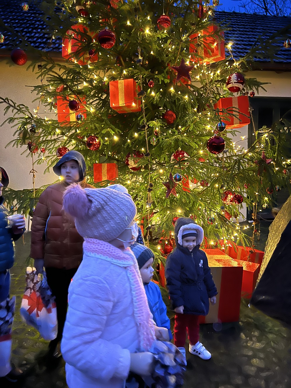 Primarul, alături de câțiva dinte copiii prezenți, au aprins luminile bradului, în aplauzele celor prezenți. Copiii au primit, din partea Familiei Regale, dulciuri și fructe.