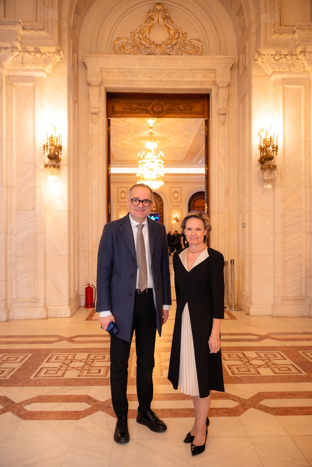 ![]() Joi, 27 noiembrie 2025, Alteța Sa Regală Principesa Sofia a reprezentat pe Majestatea Sa Margareta Custodele Coroanei române, la Gala Aniversară a Federației Române de Canotaj, la Palatul Parlamentului. Evenimentul a celebrat un secol de istorie, excelență și rezultate remarcabile obținute de canotorii României pe plan național și internațional. La gală au fost prezenți membri ai Guvernului și ai Parlamentului României, alături de numeroși reprezentanți de marcă ai sportului și ai societății civile. Au avut discursuri doamna Elisabeta Lipă, domnul Jean-Christophe Rolland, domnul Mihai Covaliu și domnul Octavian Morariu. Principesa Sofia a rostit un scurt cuvânt de mulțumire sportivilor și invitaților prezenți. În numele Majestății Sale, Alteța Sa Regală a primit trofeul centenar al Federației Române de Canotaj, în semn de recunoaștere a sprijinului constant pe care Coroana română îl acordă sportului românesc. A fost păstrat un moment de reculegere pentru canotorii care au plecat dintre noi, iar sportivii medaliați la cele mai reprezentative competiții olimpice din trecut și din prezentul recent au fost distinși pentru performanțele lor. Alteța Sa Regală a vizitat expoziția „FRC 100 ani”, care a reunit medalii, canotci, fotografii de la competiții și listele cu medaliații din ultimul secol. Programul „Școli de campioni”, inițiativă care susține performanța tinerilor și investește în viitorul canotajului românesc, a premiat cluburile de canotaj din țară. Federația Română de Canotaj se află, începând cu anul 2025, sub Înaltul Patronaj al Majestății Sale Margareta, o recunoaștere a valorilor, disciplinei și tradiției pe care acest sport le promovează. ![]() ![]() ![]() ![]() ![]() ![]() ![]() ![]() ©Alexandra Curea-Gogu, Casa Majestății Sale |