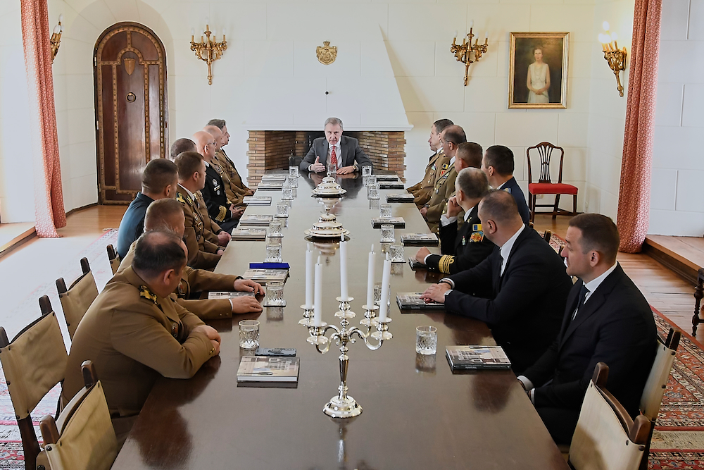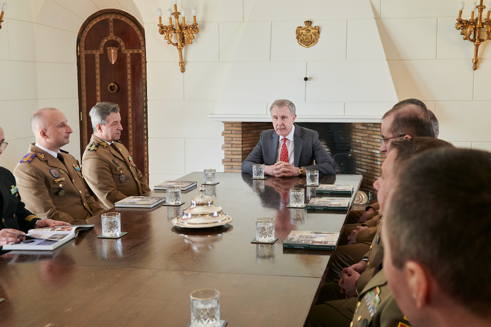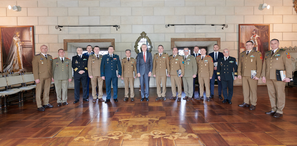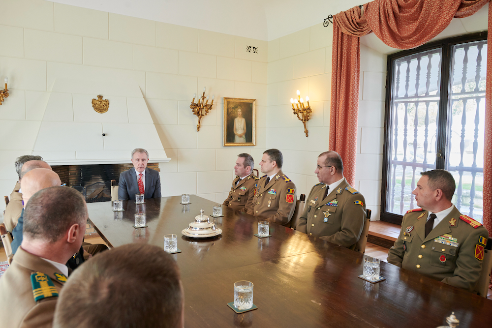 ![]() Ofițeri superiori din Ministerul Apărării Naționale, din Ministerul Apărării al Republicii Moldova și din alte structuri militare ale României, aflați la Cursul postuniversitar de Conducere Strategică al Universității Naționale de Apărare Carol I au făcut o vizită la Palatul Elisabeta în ziua de 14 aprilie 2026. Ofițerii s-au întâlnit cu Alteța Sa Regală Principele Radu, care a prezentat în fața corpului militar superior o perspectivă a acțiunilor regale care vizează apărarea și securitatea națională, precum și consolidarea democrației: legătura dintre civili și militari, învățământul militar superior, promovarea în plan extern a performanțelor și proiectelor militarilor români în NATO și UE, proiecte sociale, sportive și culturale ale militarilor veterani ai teatrelor de operații. Prelegerea a fost urmată, ca de fiecare dată, de un dialog între Alteța Sa Regală și ofițerii MApN. La finalul întâlnirii, în numele cursanților, reprezentantul Ministerului Apărării al Republicii Moldova a oferit Principelui Radu placheta absolvenților promoției 2026 ai cursului. Cursul postuniversitar de dezvoltare profesională continuă, numit “Conducere strategică”, are durata de 18 săptămâni și este organizat anual de Universitatea Națională de Apărare “Carol I, fiind unul dintre cursurile cele mai avansate ale instituției de învățământ superior militar. Cursul vizează dezvoltarea competenţelor profesionale specifice conducerii forţelor armate de nivel strategic în timp de pace, criză și război şi asigură o pregătire interdisciplinară complexă necesară perfecționării abilităţilor, caracteristicilor și deprinderilor relevante viitorilor lideri ai Armatei României. Cursul se organizează o data pe an. Începând din anul 2012, cursanții Universității Naționale de Apărare au inclus în programul lor de studii o întâlnire cu membrii Familiei Regale la Palatul Elisabeta, iar tradiția aceasta a continuat an de an, neîntrerupt. ![]() ![]() ![]() ![]() ![]() ![]() ![]() ©Daniel Angelescu, Casa Majestății Sale |