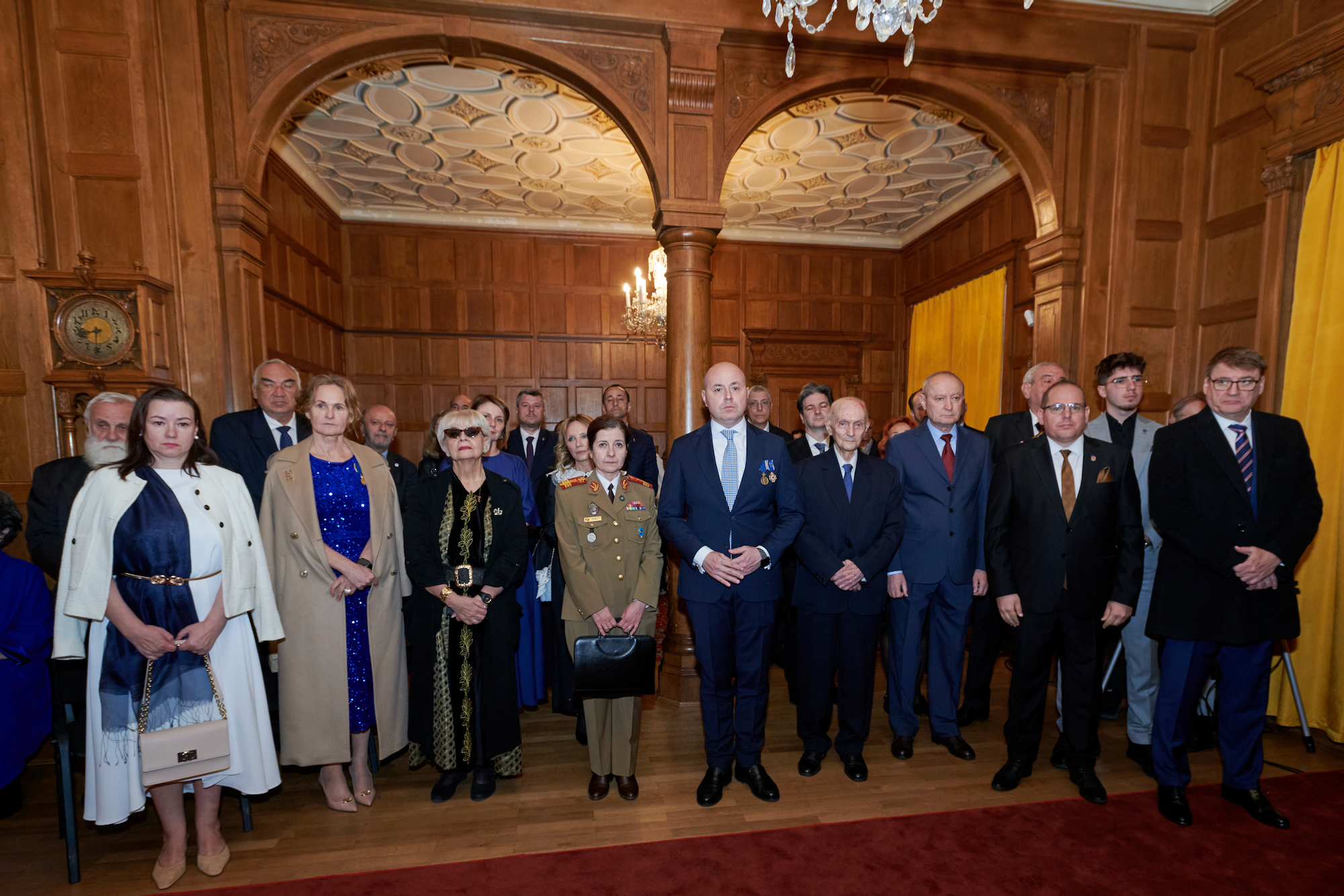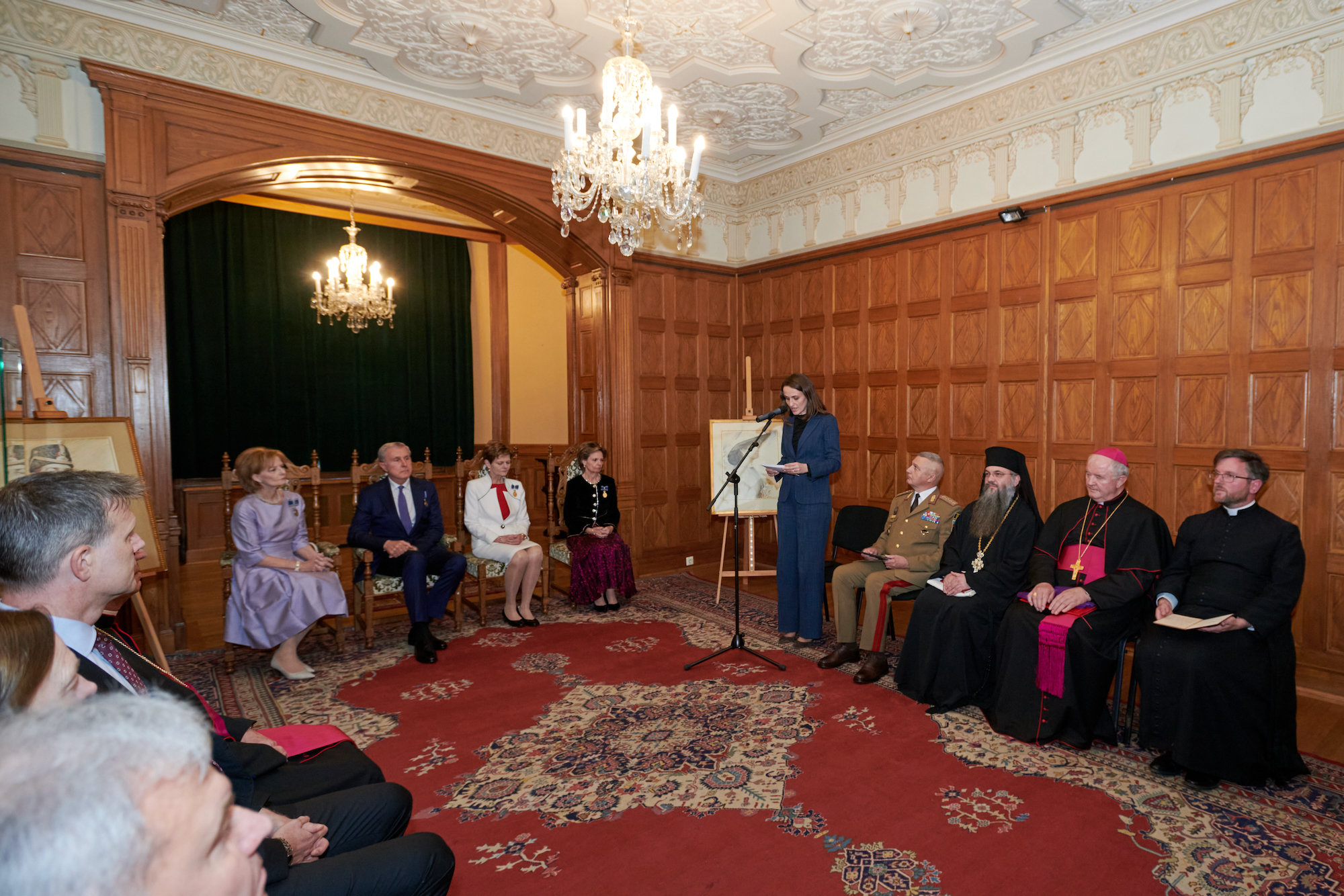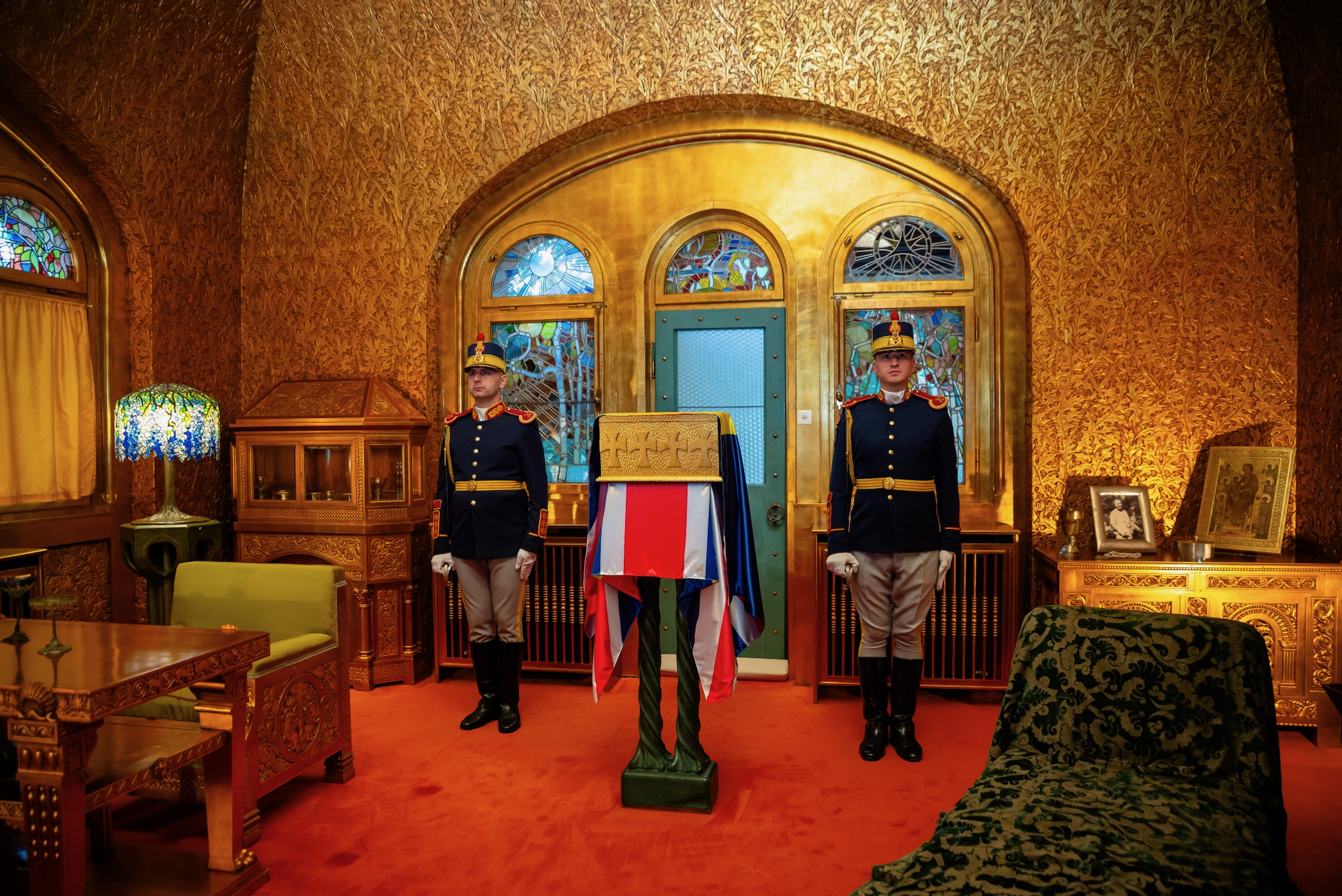 ![]() În anul 2025, Suveranii României Mari sunt împreună sărbătoriți de societatea românească, la împlinirea a 160 de ani de la nașterea Regelui Ferdinand Întregitorul și a 150 de ani de la nașterea Reginei Maria. AGERPRES Majestatea Sa Custodele Coroanei a dorit să aducă un omagiu strămoșilor săi în ziua de 29 octombrie, ziua de naștere a Reginei Maria, în chiar căminul lor de o viață, Castelul Pelișor. Alături de Principele Radu, Principesa Elena și Principesa Sofia, Majestatea Sa a invitat reprezentanți ai Statului român și personalități ale societății civile, pentru a celebra neprețuita moștenire istorică și legământul suveranilor care și-au legat numele de unitatea, identitatea și statornicia României moderne. La sărbătorire au luat parte Ministrul Afacerilor Externe, ES doamna Oana Țoiu, și Șeful Statului Major al Apărării, generalul Gheorghiță Vlad, alături de Decanul Corpului Diplomatic, ES Arhiepiscopul Giampiero Gloder, Nunțiul Apostolic, ambasadorul Republicii Federale Germania, ES doamna Angela Ganninger, ambasadorul Regatului Unit al Marii Britanii și Irlandei de Nord, ES dl Giles Portman, și ambasadorul Republicii Moldova, ES dl. Victor Chirilă. Majestatea Sa a invitat, de asemenea, pe Părintele Arhimandrit David Petrovici, exarhul Zonei de Munte a Arhiepiscopiei Bucureștilor a Bisericii Ortodoxe Române, pe ÎPS Aurel Percă, Arhiepiscop și Mitropolit Romano-Catolic de București, și pe părintele Nevsky Everett al Bisericii Anglicane. În Holul de Onoare al Castelului Pelișor au fost prezenți reprezentanți ai altor instituții ale Statului român și personalități ale societății civile. Au rostit un cuvânt de recunoștință Principele Radu, Ministrul Afacerilor Externe, Șeful Statului Major al Apărării, iar reprezentanții Bisericilor Ortodoxe, Catolice și Anglicane au rostit rugăciuni. După sărbătorirea din Holul de Onoare, Familia Regală, demnitarii Statului și reprezentanții Instituțiilor Credinței au urcat în Camera de Aur a Castelului Pelișor, unde odihnește Inima Reginei Maria, pentru a se ruga și a păstra un moment de reculegere. ![]() ![]() ![]() ![]() ![]() ![]() ![]() ![]() ![]() ![]() ![]() ![]() ![]() ![]() ©Daniel Angelescu și Alexandra Gogu, Casa Majestății Sale |